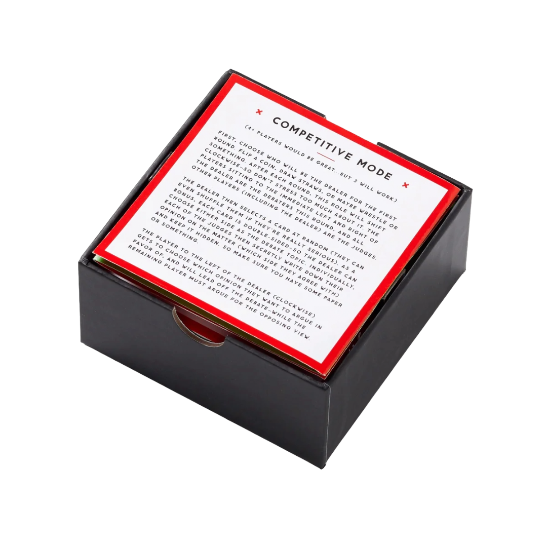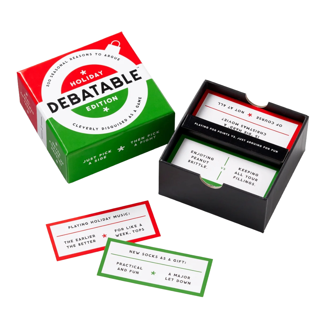 It’s the most wonderful time of the year to play games. In this holiday-specific version of Debatable, we’ll obviously focus on the important stuff like: Is Die Hard a Christmas movie? Which is better: fresh or canned cranberry sauce? Is peanut brittle the best thing on earth, or a tooth removal device disguised as candy? Bring Holiday Debatable to your next party and watch it be a guaranteed hit!