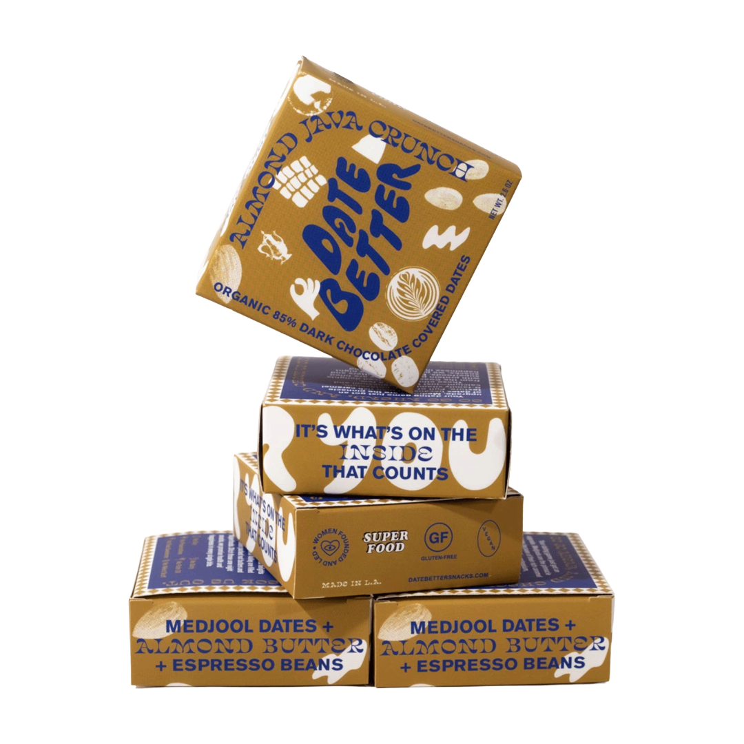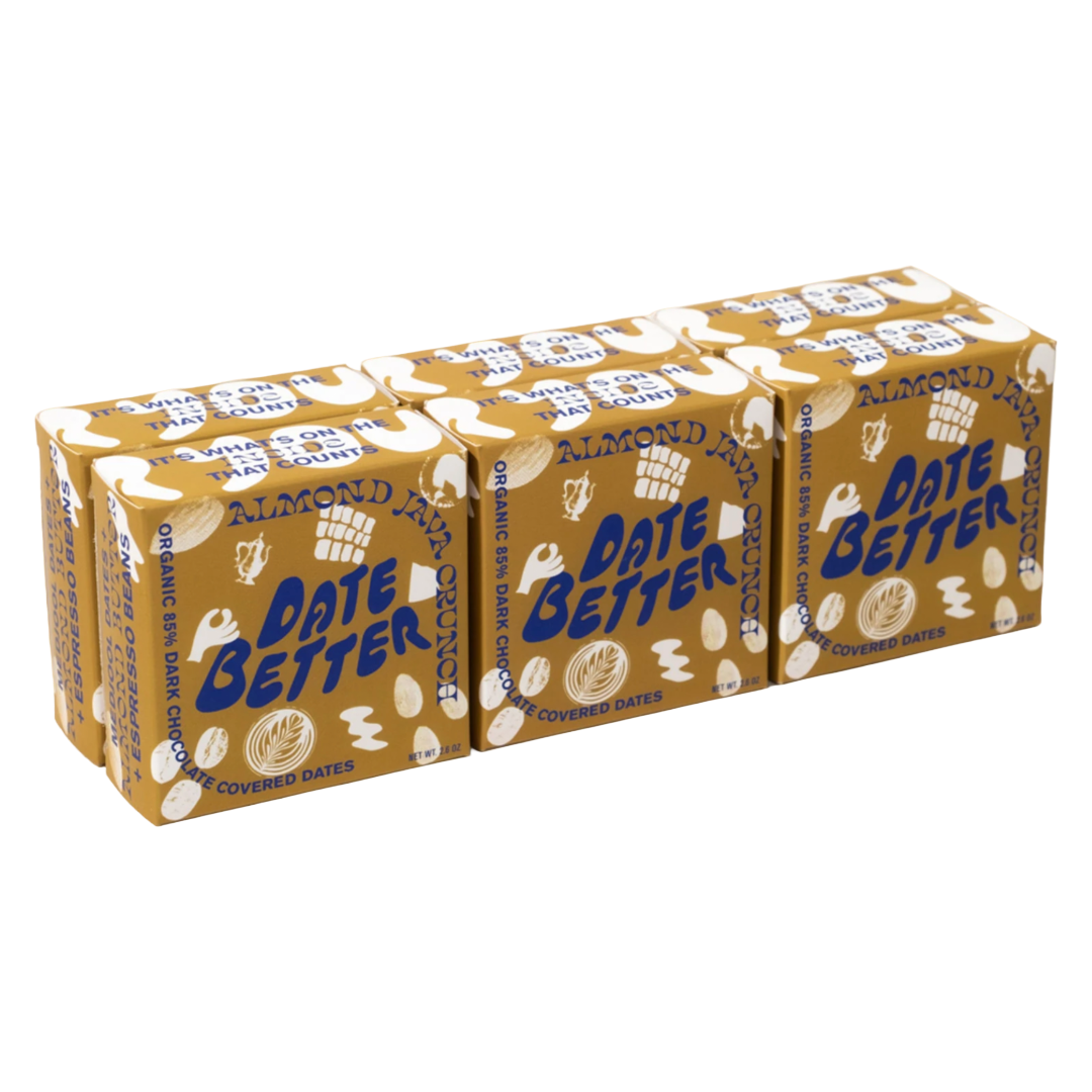 - Medjool Dates are filled with creamy almond butter with bits of espresso beans then covered in 85% dark chocolate and topped with flaky sea salt.
