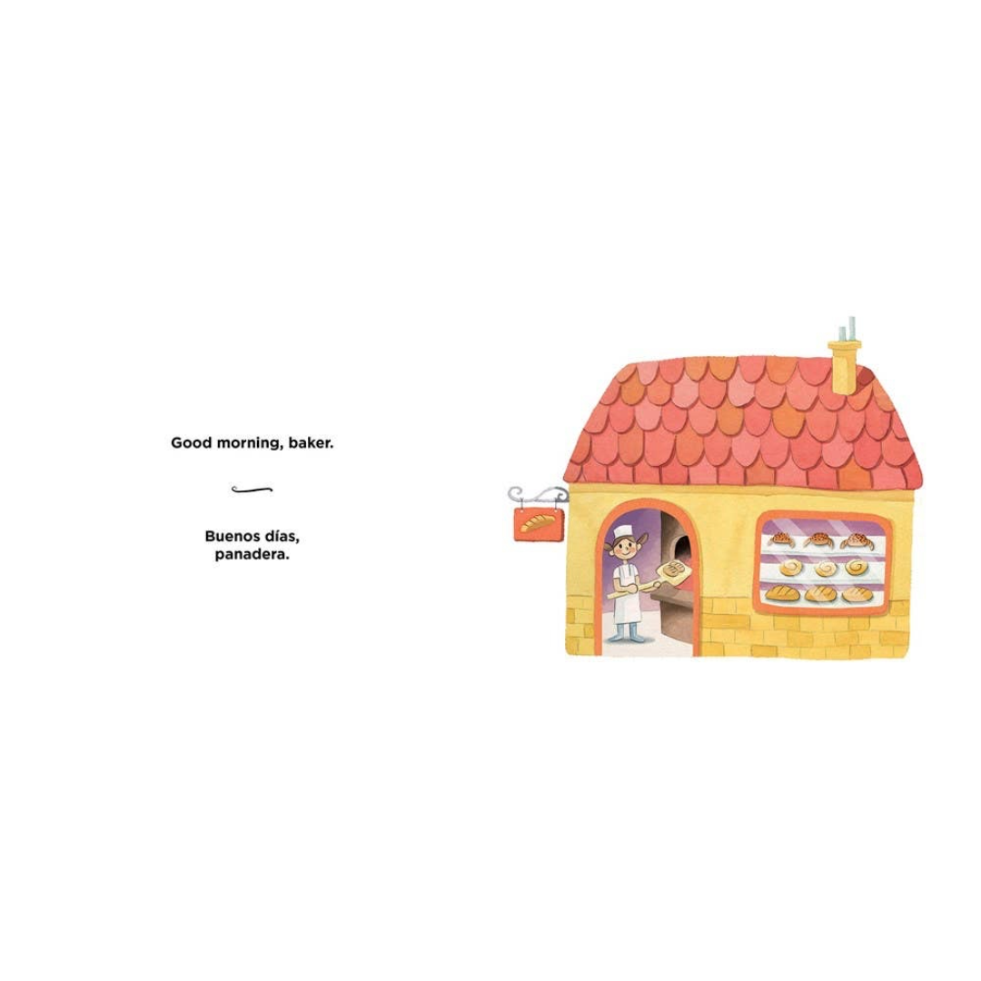 A bilingual slide-the-tab board book, with text in English and Spanish. Cleverly introduce basic ideas about what happens in the morning when you wake up, including a rooster crowing, an alarm clock ringing, Dad shaving, and neighbors making coffee. The tabs add fun and unexpected movement for illustrator Xavier Salomó’s simple but engaging art.