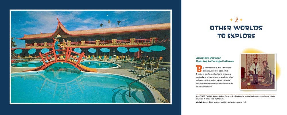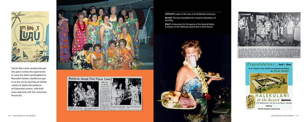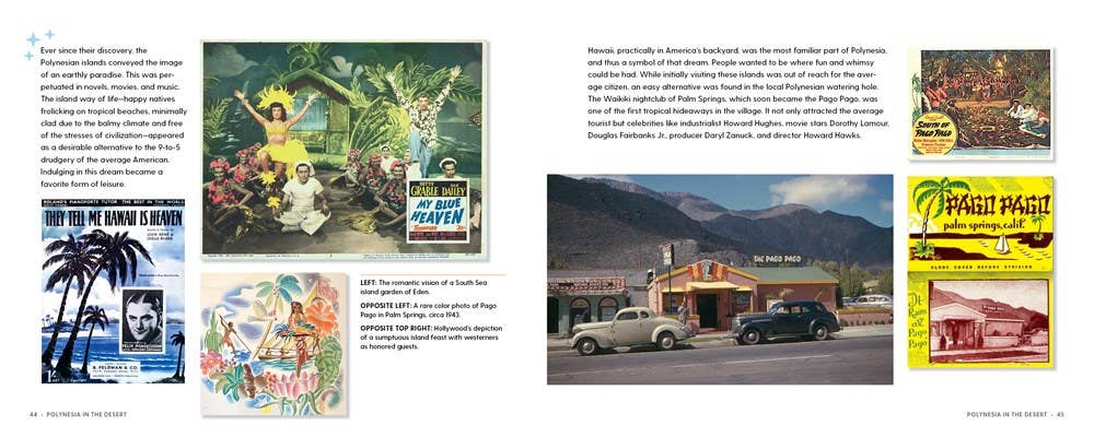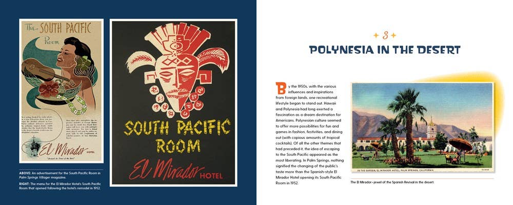 Palm Springs Tiki presents a visual exploration of a mid-century tropical paradise in the California desert. From the 1930s through the 1970s, Palm Springs and other desert communities embraced the mid-century fantasy of a home-grown Polynesian paradise. The concept of the oasis and that of the tropical island shared the qualities of exotic escapism for the urban dweller, these would-be islanders under the desert sun. Sprouting from the arid desert were Polynesian restaurants, bars, nightclubs and lounges, hotels, motels, apartments, and trailer parks decorated with Tikis.