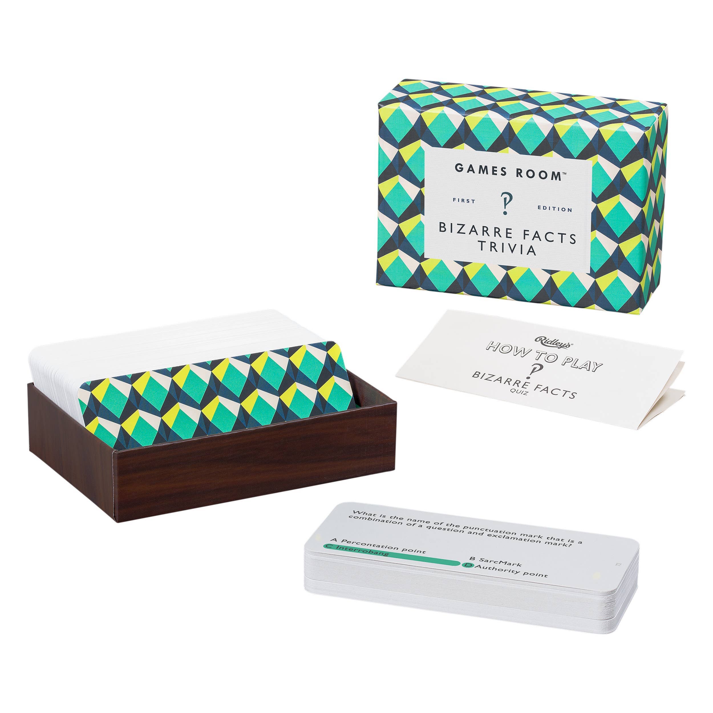 The bizarre-er the better with this Bizarre Facts Trivia from the Games Room collection. There are 140 quiz cards to test your knowledge of the unusual and absurd! A fun and factual game to play with friends. Presented in a stylish geometric print box. Full instructions included.
