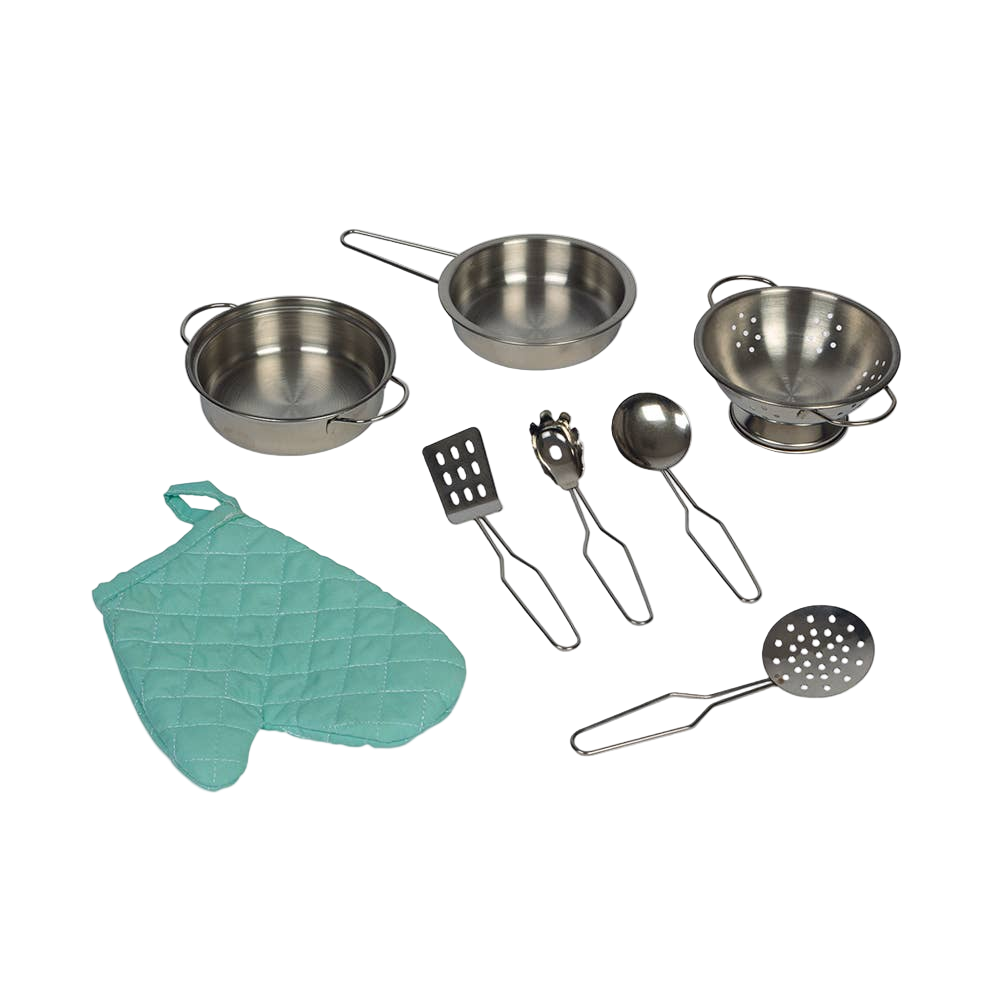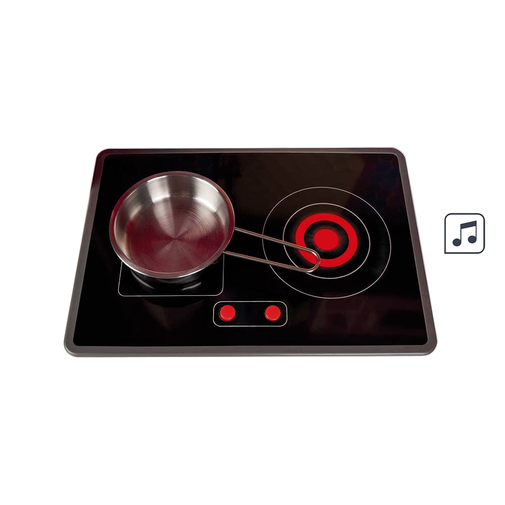 This beautifully designed wooden kitchen set combines soft colors and a modern aesthetic with tons of interactive features that spark imagination and creativity. Whether playing solo or with friends, kids will love exploring all the possibilities this double-sided kitchen has to offer. Features a light-up induction cooktop with sound effects. Press the red buttons once to light it up, again to hear boiling water, and a third time to turn it off. (Auto shut-off after 30 seconds for safety.) Includes a functional clock with movable hands, a metal sink, and two sound-effect knobs for added realism. Perfect for group play! This kitchen is a beautiful and lasting addition to any playroom.