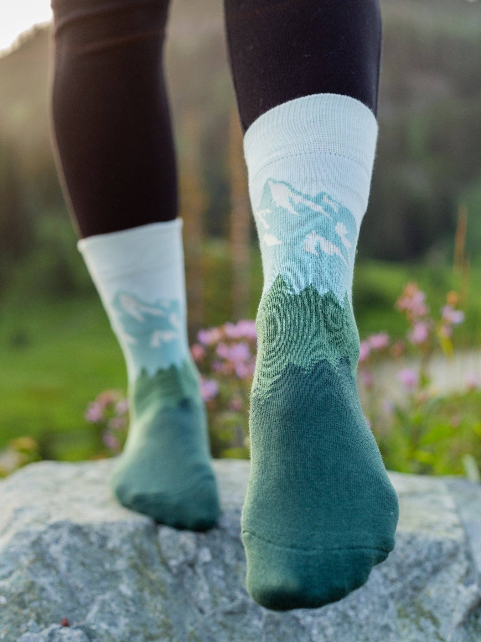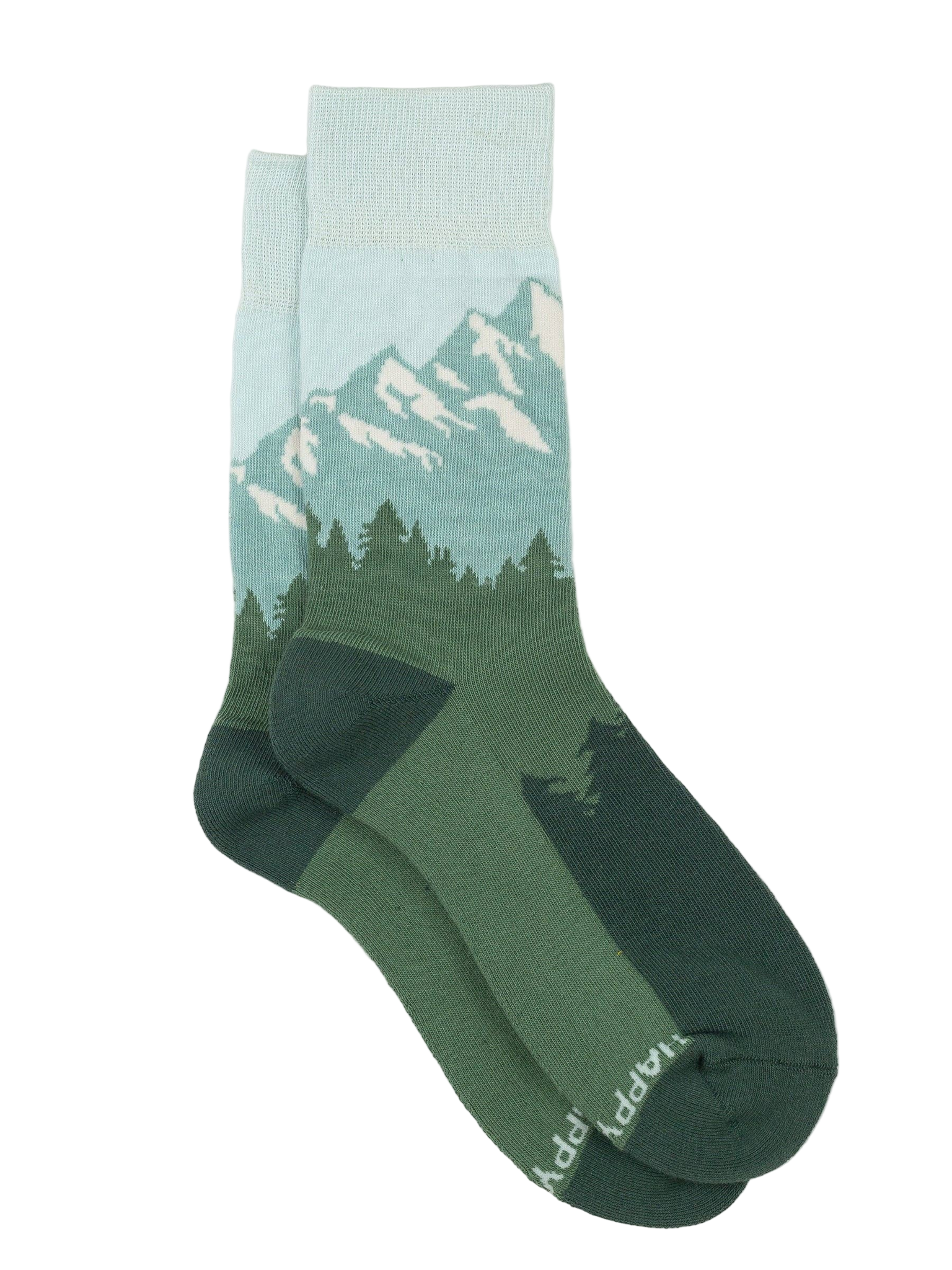 Soft blues and greens paint this scene of a sweeping forest nestled within a cascade of snow-tipped mountains. Soft, supportive socks made to put your best foot forward. Knit from comfy, breathable organic cotton with a touch of recycled nylon and elastane to enhance flexibility and moisture-wicking performance.