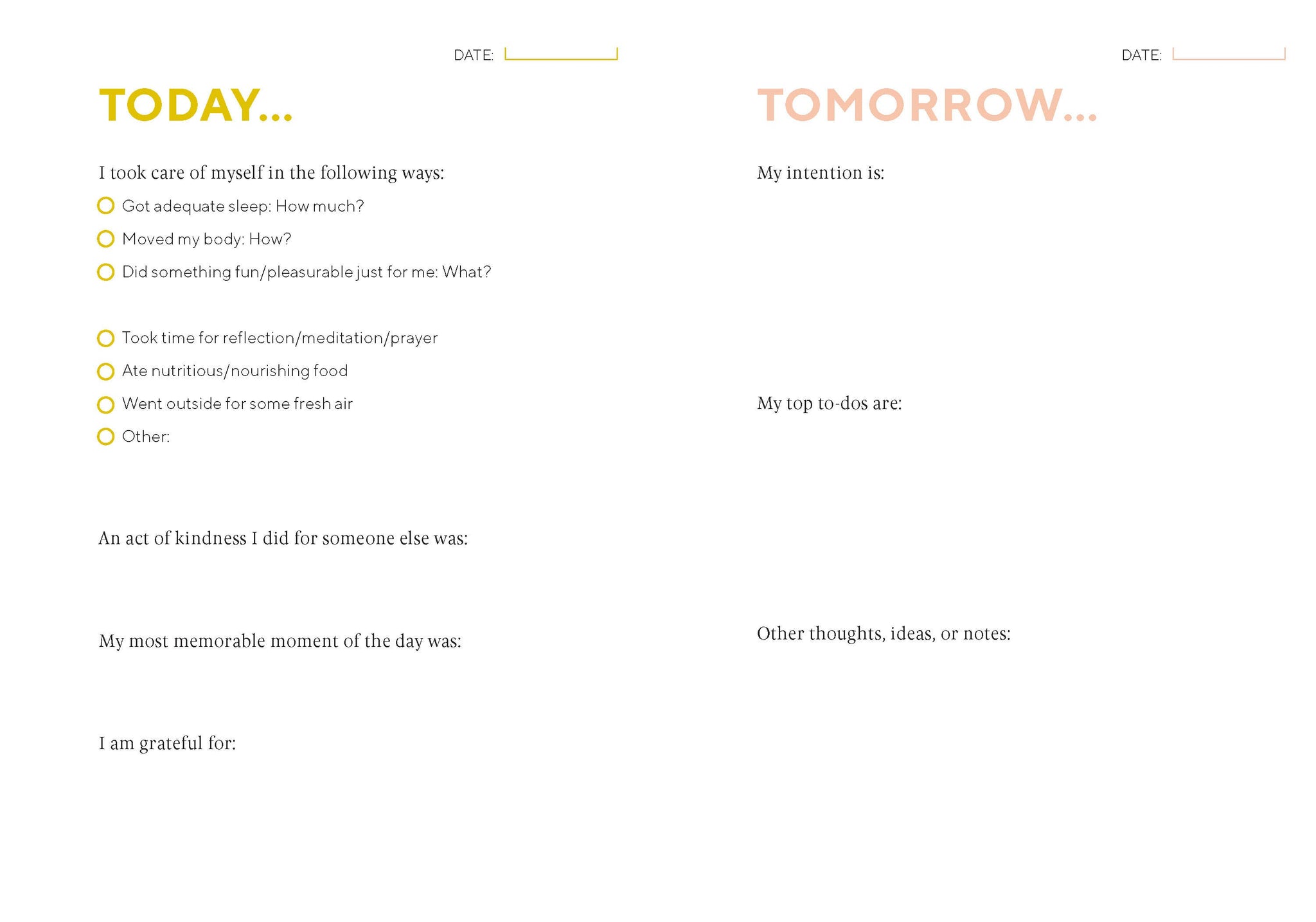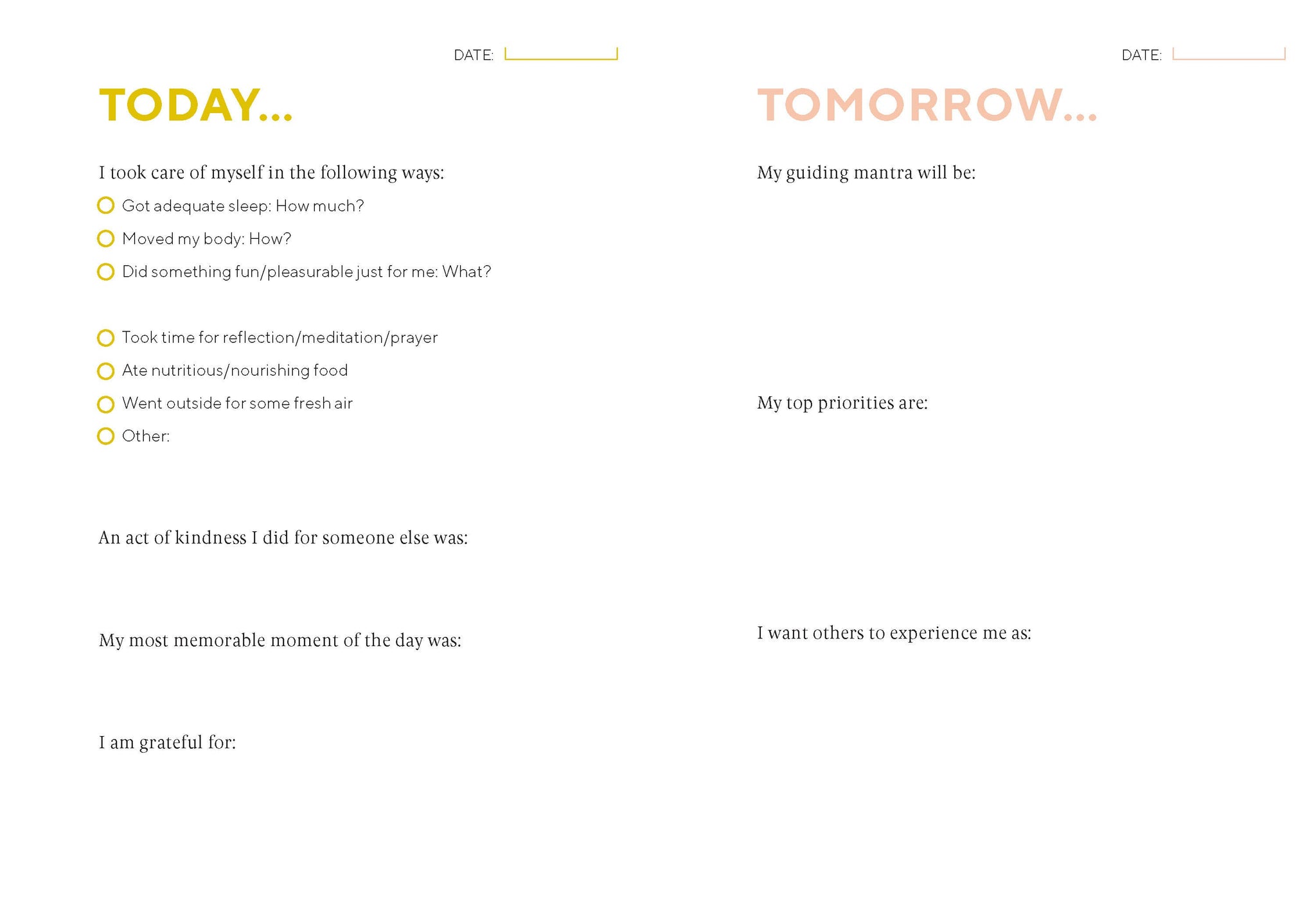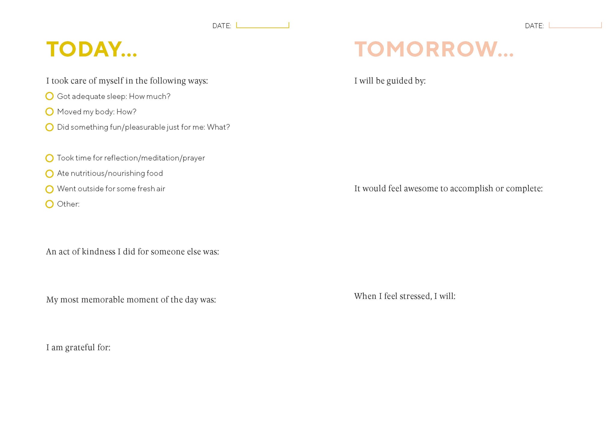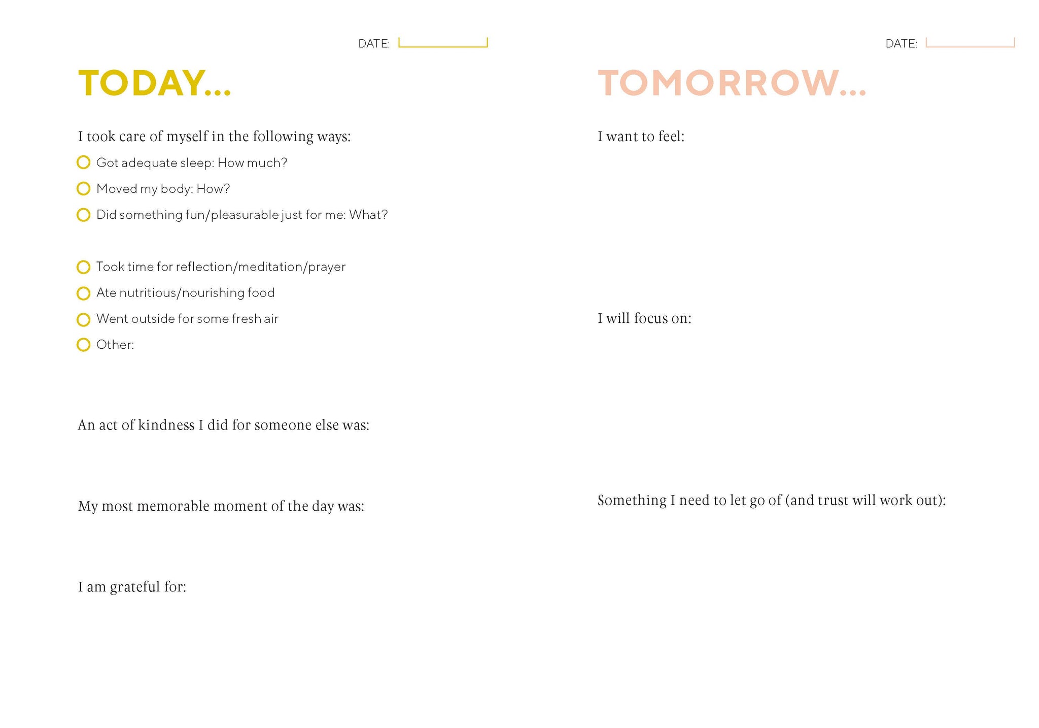 Trying to juggle multiple responsibilities while keeping up with endless to-do lists and trying to balance family, work, social and personal time can be overwhelming and lead to burn out. This journal is just the thing to help manage daily stress and quell anxiety so it doesn’t build up over time. Creating the space for a simple daily routine of reflection and intention can do wonders to calm inner chaos when the outside world starts to take over. Anyone seeking inner balance, harmony and tranquility will make this journal a habit. It won’t solve problems, but it will do wonders for those in need of some peace of mind. It is a great addition to any self-care practice.