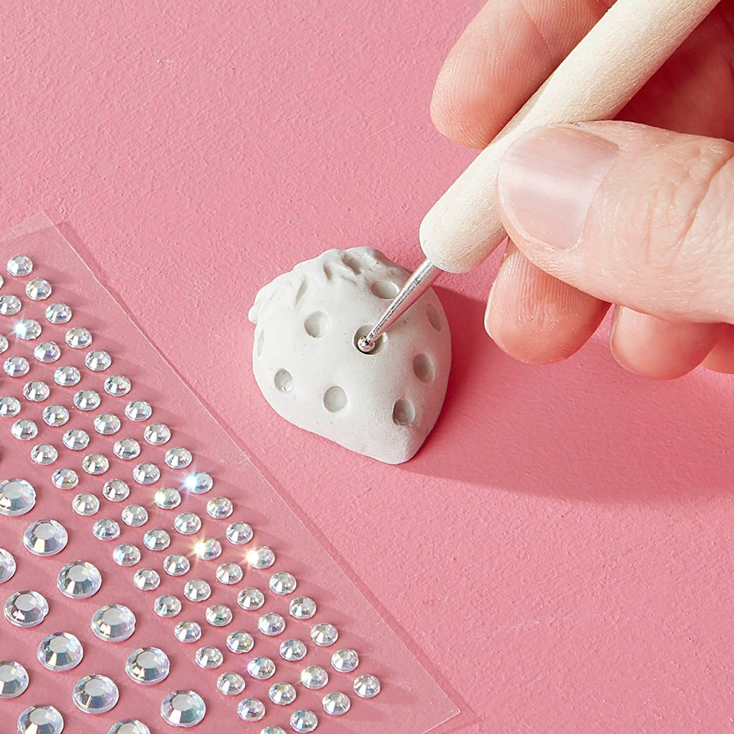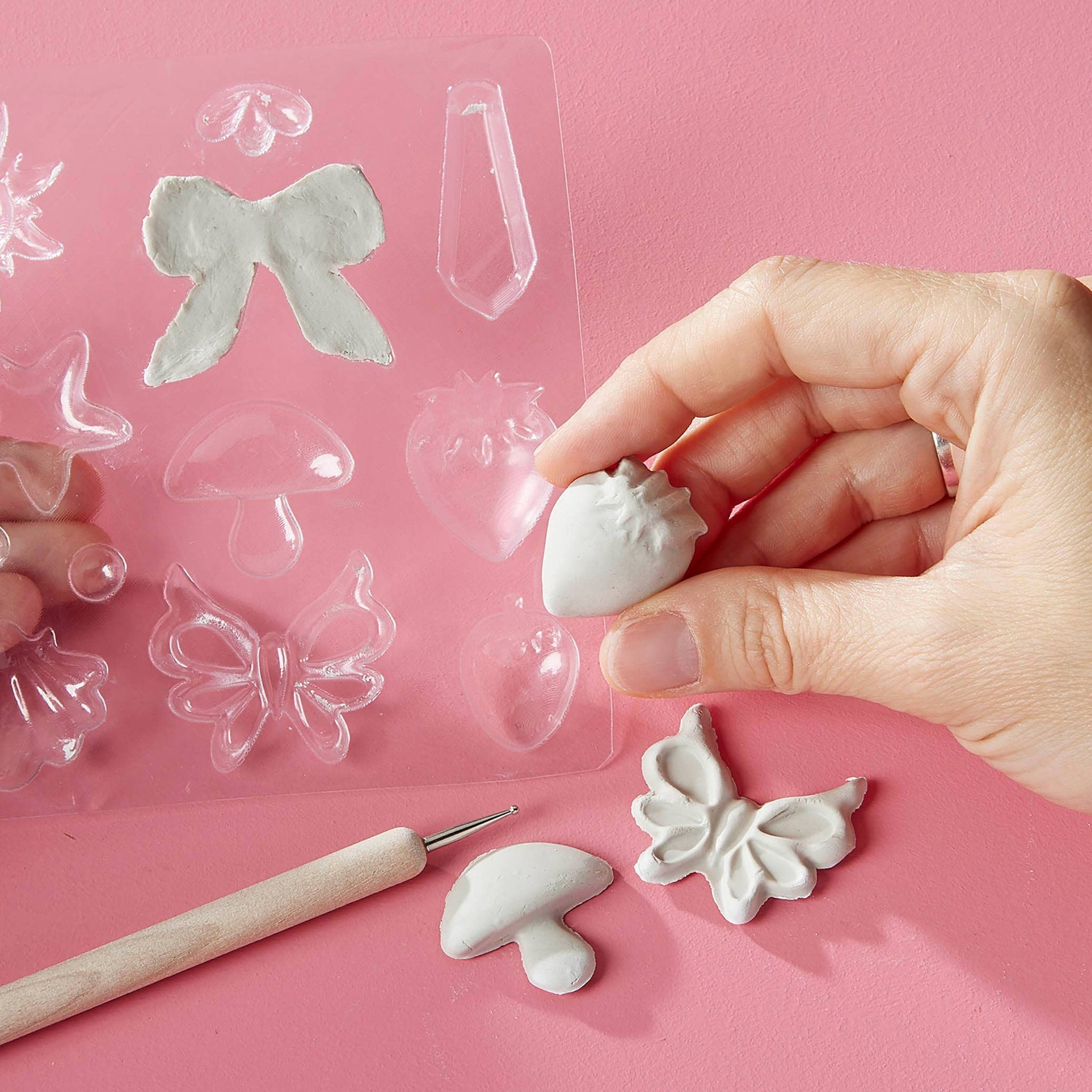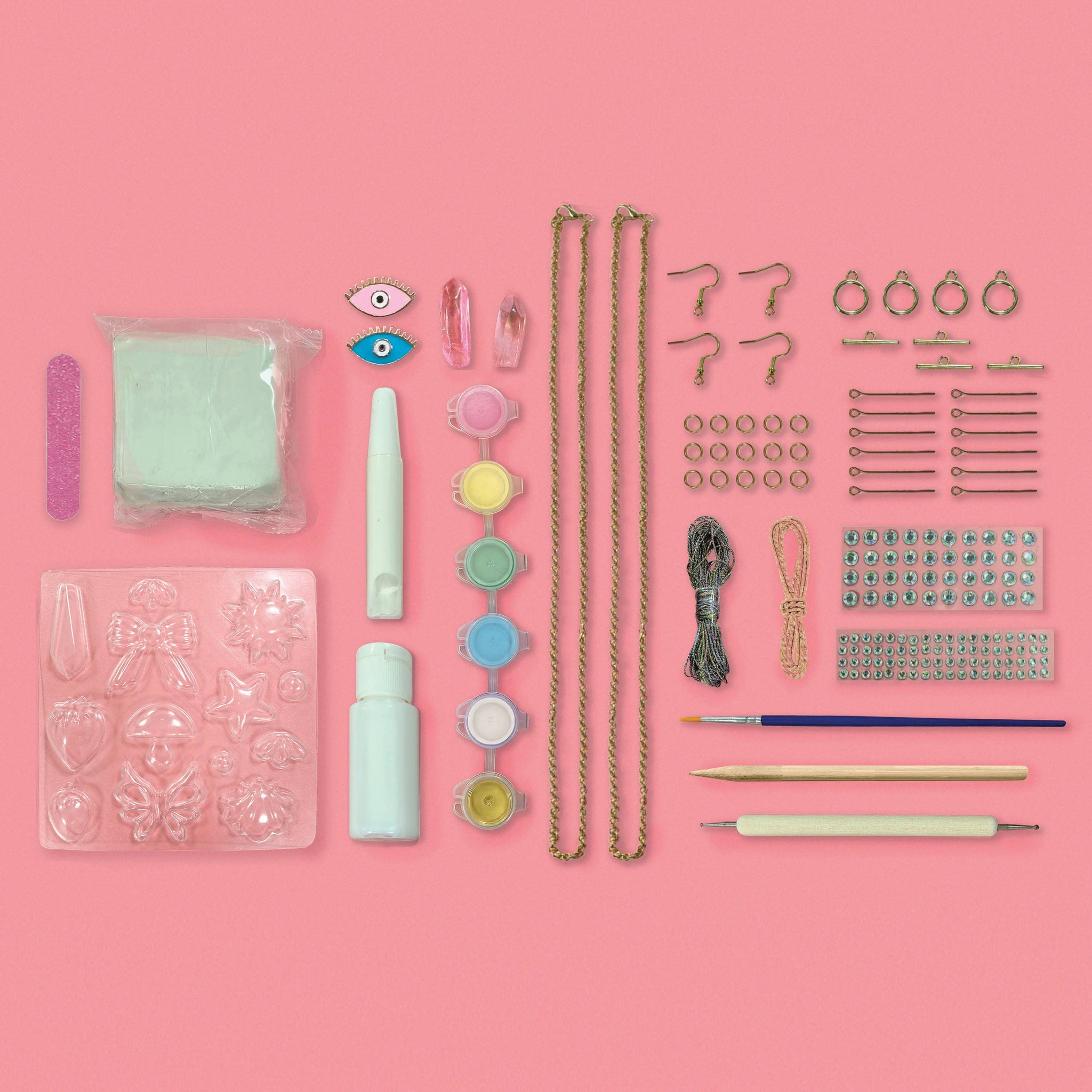 Create over 25 gorgeous trendy charms with air dry porcelain clay, real crystals, gems, chains, paint and opalescent glaze. Just mold, paint and create! Real crystals and jewelry findings make it elevated!