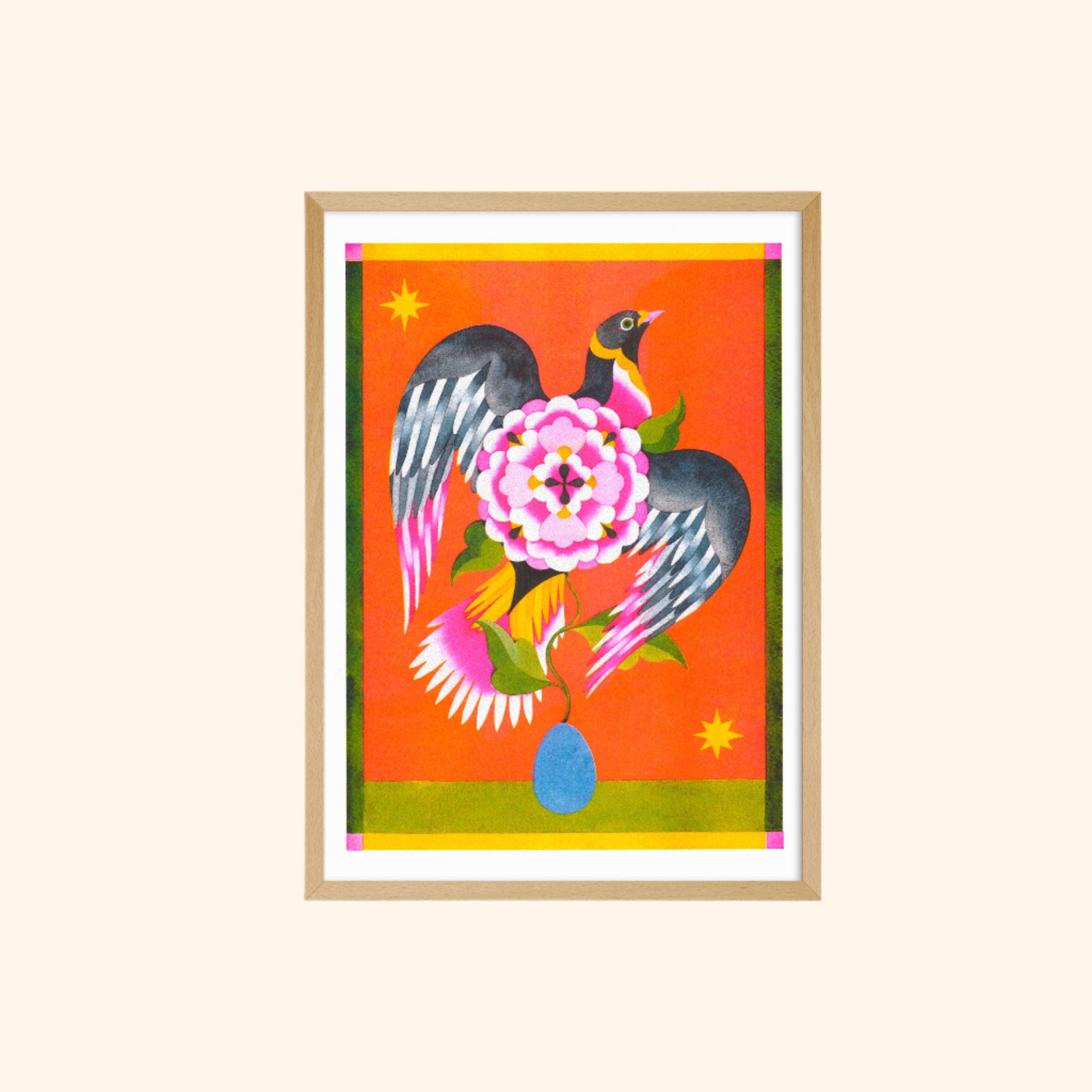 Risography printing by KIBLIND Atelier. From the hands of this fabulous illustrator is a riso poster that is a declaration of love to the fascinating, free and terribly poetic little animals that are birds. Add the delicacy of a few flower petals and you have a poster that looks like sweet poetry.