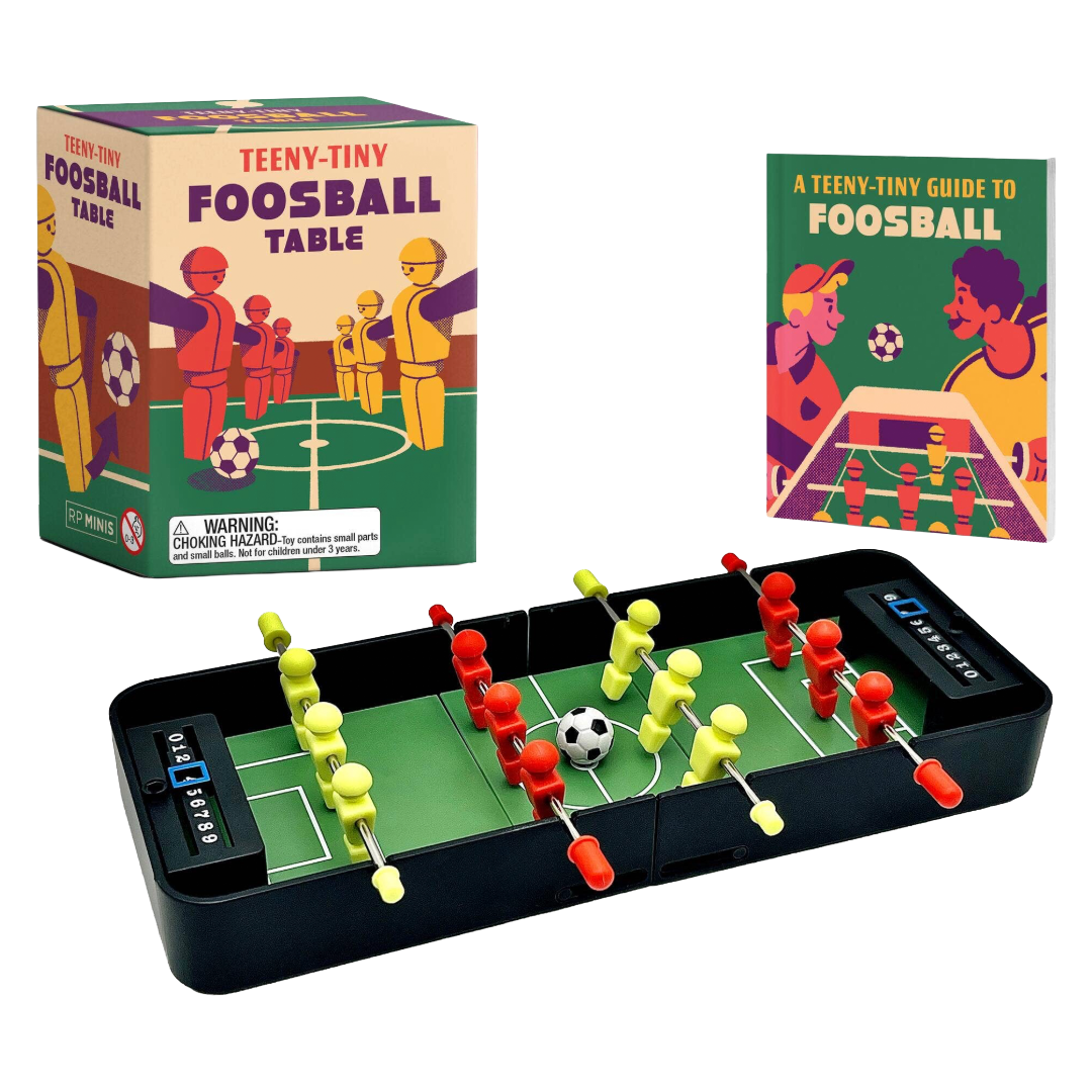Grab those handles and prepare to take wild shots on goal in this miniature desktop version of the classic bar and basement game: foosball! Super portable size: The 7-inch-long, fully functional foosball table fits in the palm of your hand and folds up for easy storage. The Kit includes a 32-page mini book on the history and rules of the game. Keep track of the competition with a built-in score counter at each end, and there's no need to second-guess who is ahead. The perfect gift, a bit of nostalgia, or self-purchase for anyone who had a foosball table in their basement or local bar (or always wanted one!)