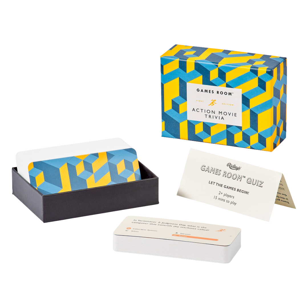 Strap yourself in for heart thumping high octane action movie trivia with this Games Room Action Movie Trivia! Who will be the resourceful hero and who'll be the superfluous henchman? Test your knowledge on action films from Die Hard to Taken and see who is the ultimate action film fanatic! Packaged in a geometric print box, the set contains 140 question cards and instructions.