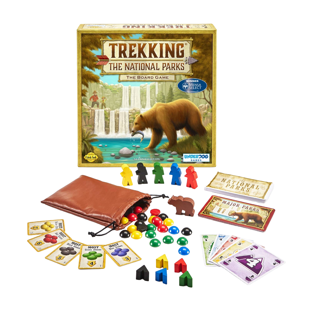 Trekking the national parks is an award winning family board game where up to six players can visit our country’s majestic parks in a fun and competitive way! Gathering trek cards allows players to move across the map and claim valuable park cards. If a player is the first to visit a national park, they collect that park's stone, which award bonus points at the end of the game. Players must jockey for position and make tough tactical decisions at every turn to emerge victorious!