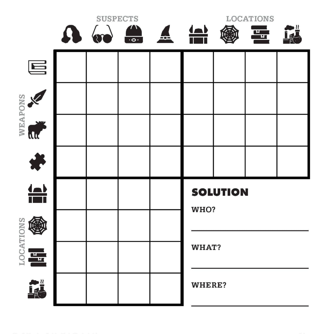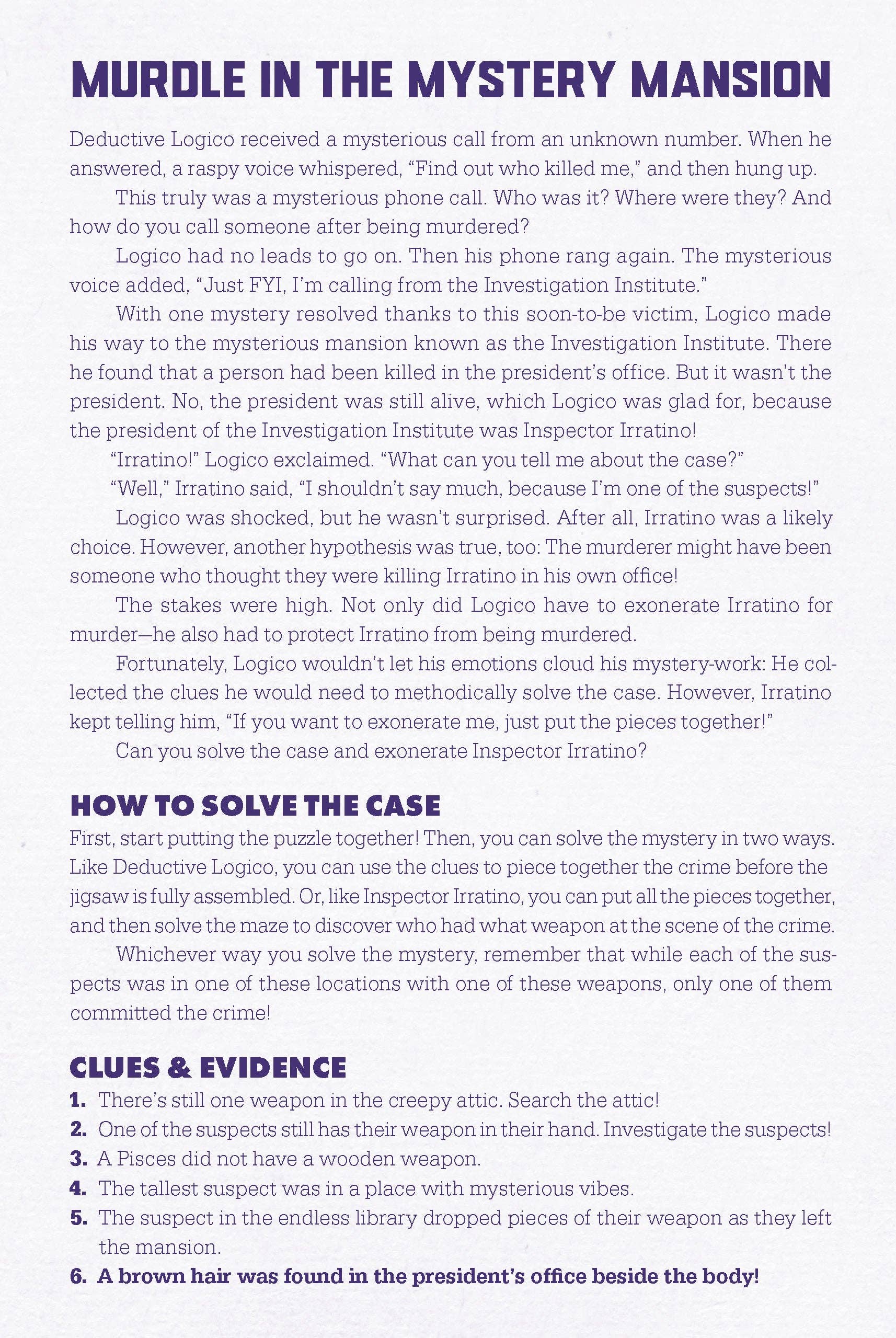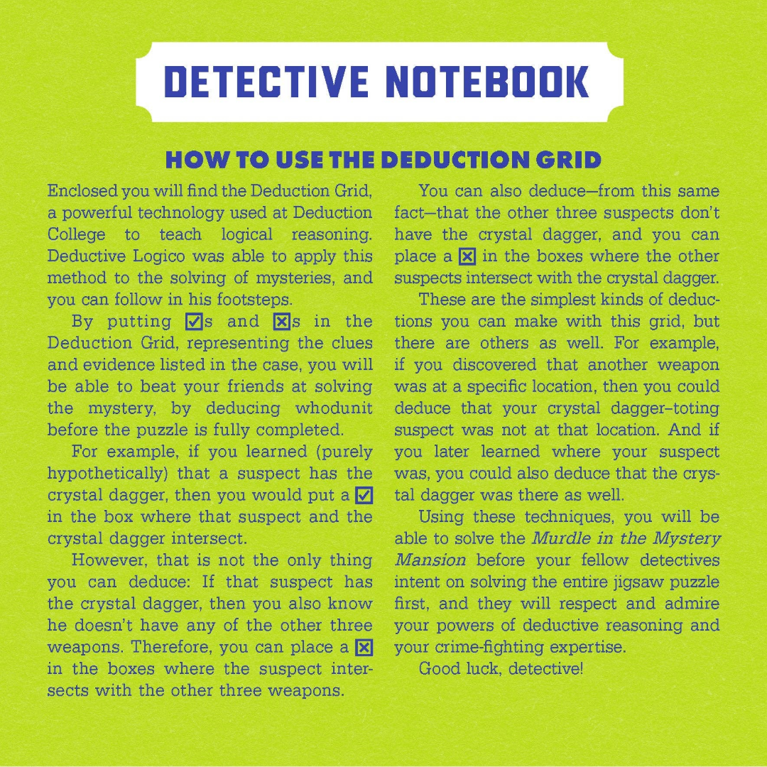 An all-new mystery jigsaw puzzle for fans of the worldwide phenomenon Murdle! Creator G. T. Karber teams up with maze master Sean C. Jackson to create a unique and unforgettable puzzling experience! There's been a murder in Dame Obsidian’s mystery mansion, and Deductive Logico is on the case. This 500-piece jigsaw puzzle is a challenging combination of logic puzzle, jigsaw puzzle, and maze. Test your puzzle-building skills and your powers of deduction as you uncover who committed the murder. To play, open the puzzle box to find a Murdle story and logic puzzle printed inside, complete with clues, suspects, weapons, and locations. Detectives must assemble the jigsaw puzzle without a full image to guide them, use the logic grids in their detective notebook to evaluate the evidence, and solve the maze within the puzzle image to solve the crime.