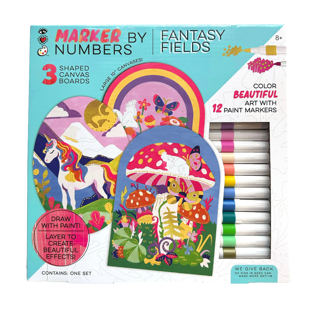 Discover a new and exciting way to create beautiful art! Use brush-tipped paint markers to fill in the numbered areas and add details. It's easy to create intricate art! Perfect for kids aged 8 and up, this set lets you explore a magical world of fantasy fields using vibrant acrylic markers instead of traditional paint. So much joy as you can bring to life whimsical scenes of unicorns, butterflies, and wildflowers. The unique shaped canvas boards add an extra element of fun, allowing your artwork to stand out with its bold, colorful designs. Dive into a world of imagination and watch your artwork transform into a masterpiece!