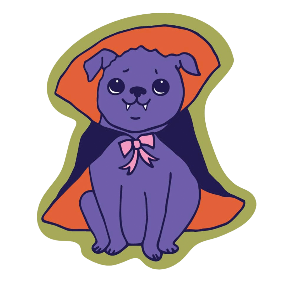 The Good Twin's studio pug Stevie, in vampire form! Vinyl stickers are super durable, waterproof and weatherproof - great to decorate a water bottle or laptop!