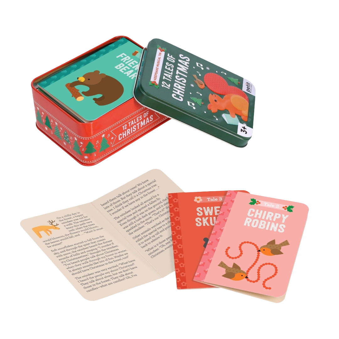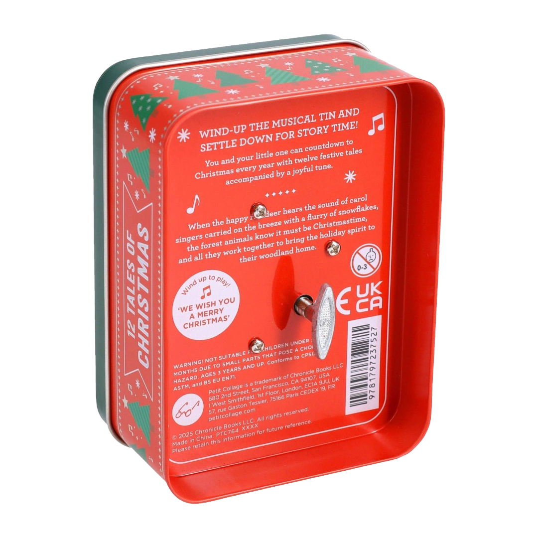 Wind up the musical tin and settle down for story time with the 12 Tales of Christmas! Countdown the twelve days to Christmas by reading a sweet and cheerful story with your little one, accompanied by the joyful tune of “We Wish You A Merry Christmas,” played through a nostalgic wind-up tin. The short story series tells the tale of how your child’s favorite forest friends are celebrating the festive season. When the happy reindeer hears the sound of carol singers carried on the breeze with a flurry of snowflakes, the animals know it must be Christmastime, and they all work together to bring the holiday spirit to their woodland home. Inside the musical tin are twelve timeless tales for you and your child to enjoy every year, and with no batteries needed to make the song play, this set can become a treasured keepsake to pass down and enjoy through generations.