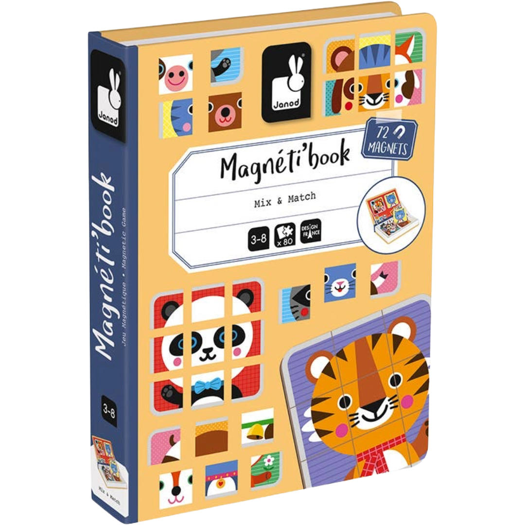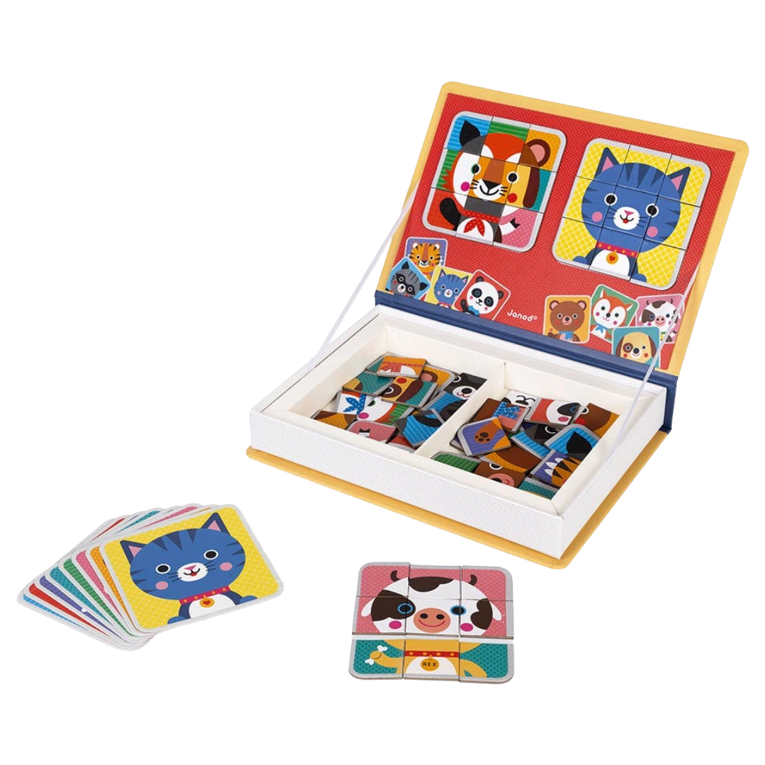 Cardboard magnetic educational game based on the theme of animals, composed of 72 magnets and 8 cards. Once the book is opened, the object of the game is to use the magnetic background for the placement of magnets to recreate the picture of the animal indicated on the card. Children can also have fun mixing the various interchangeable pieces to create eccentric animals.