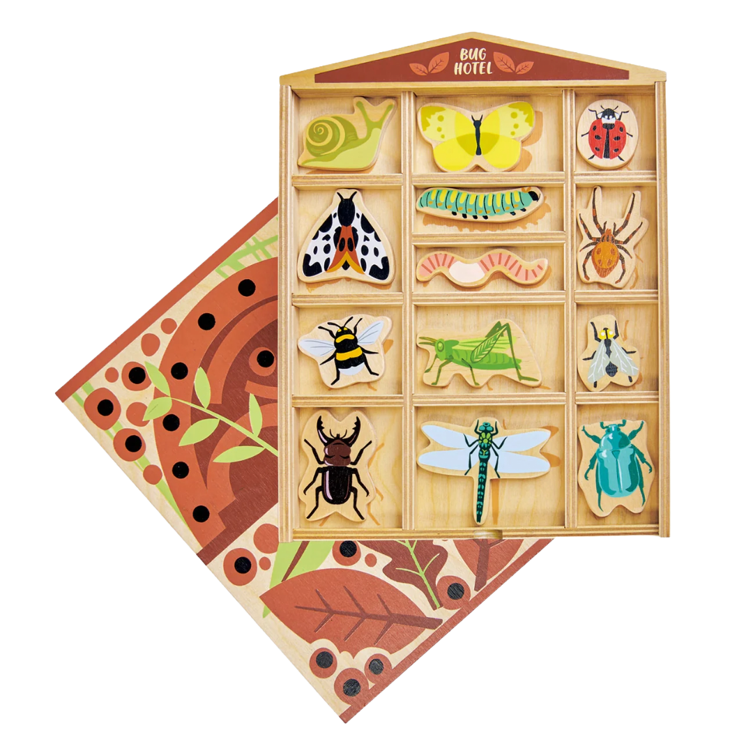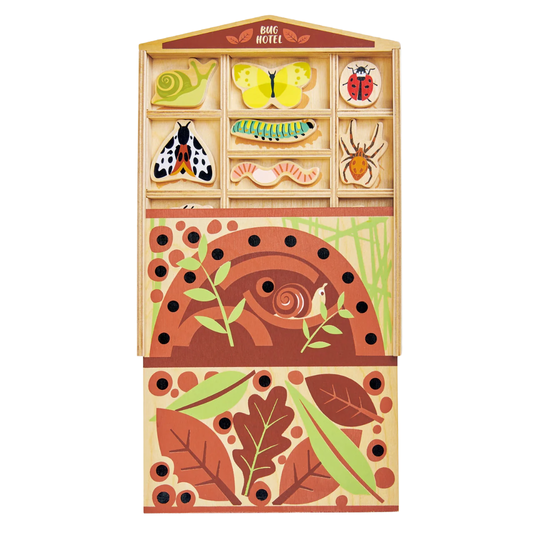 Thirteen common garden bugs are illustrated on plywood and contained in their very own bug hotel!