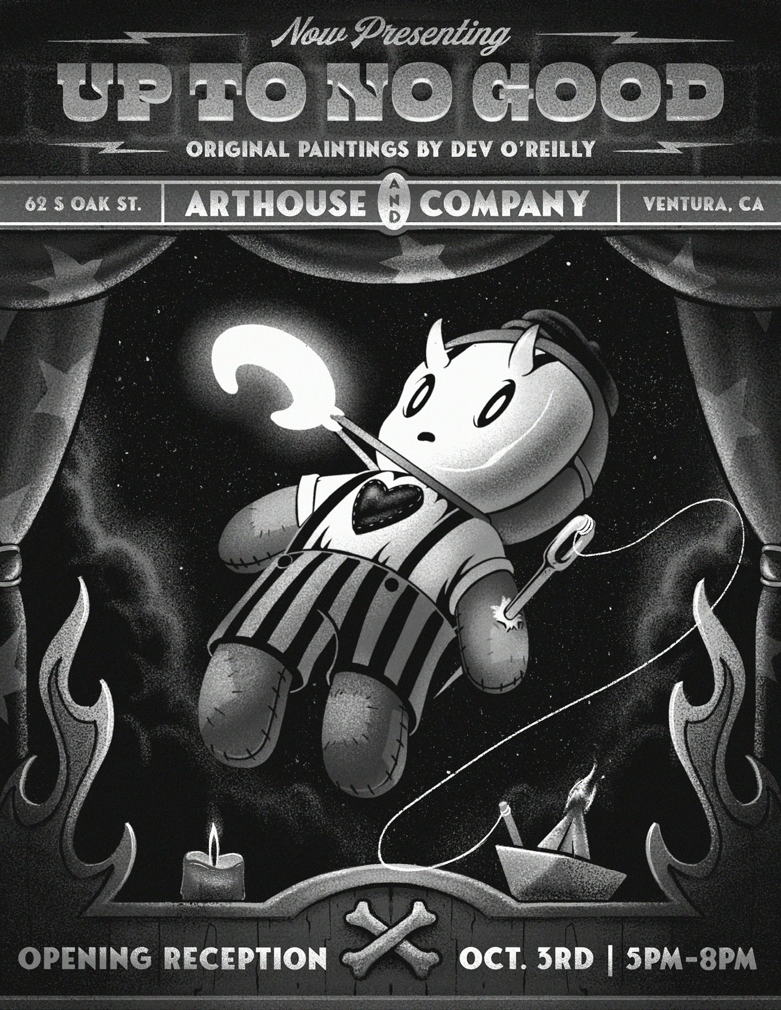 At the heart of Dev’s new show is a haunted puppet theater—clever, spooky, and surreal. “Up To No Good” is a world Dev has crafted to bring his dark & playful characters to life, and the fun is just beginning!