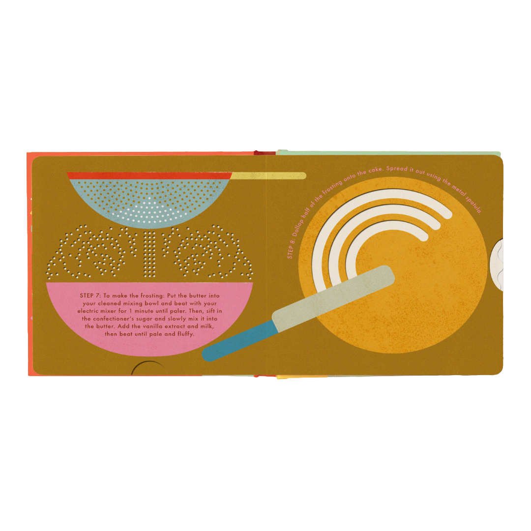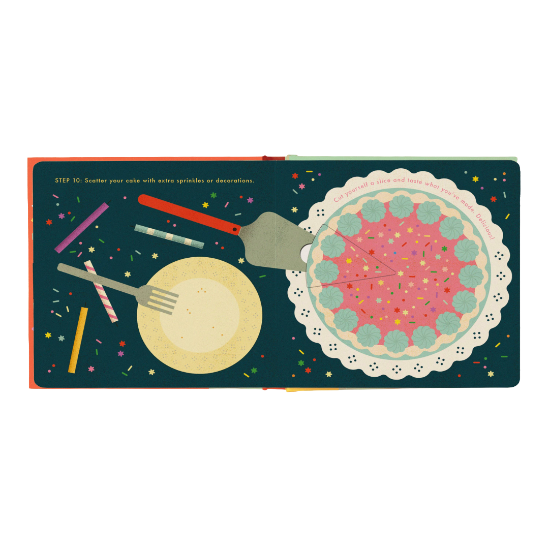 Make a cake from scratch with the next interactive board book in this globally bestselling series – mix, bake, and decorate without the mess! Invite young children into the kitchen with this toddler-friendly introduction to cooking. Colorful, charming, and cleverly designed, Cake! features sturdy paper-engineered parts to guide future foodies through a simple recipe, from greasing the pan to decorating with sprinkles. Pull a tab to mix the batter, turn a wheel to pipe the frosting, pop out the cake piece to serve, and much more. Lotta Nieminen’s stylish design style elevates this bold, graphic board book, making it a special gift that will be treasured by the next generation of chefs. The book includes a real and fully tested recipe, so that parents and kids can bake a real homemade funfetti cake, as well. A sweet addition to the beloved Cook in a Book series, Cake! is one hundred percent adult-free, danger-free, and mess-free. Making a cake has never been so independent!