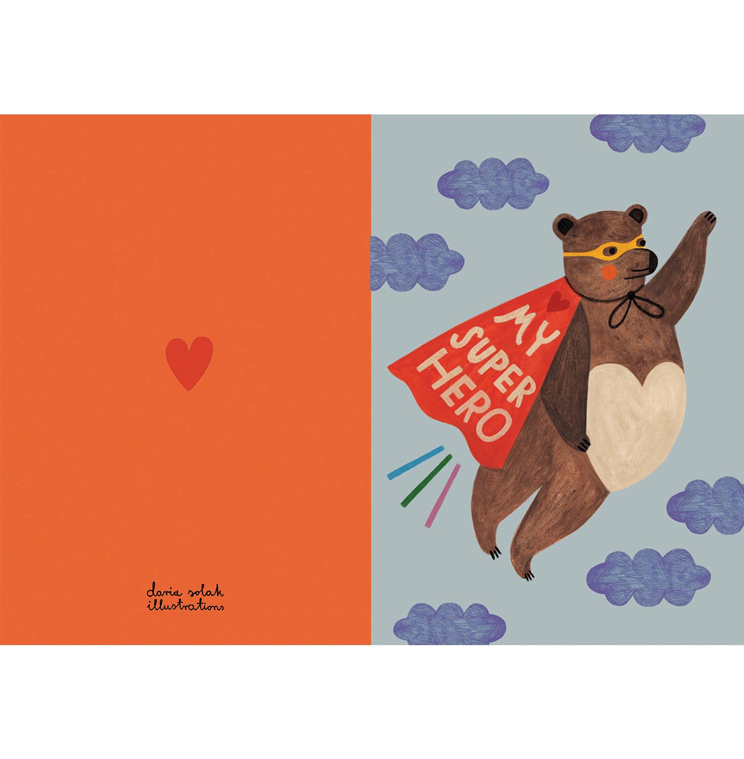 Daria Solak Illustrations brings you the SUPERHERO card. This London-based illustrator loves to make you smile with her colorful designs. This A6 sized card originates from hand-drawn illustrations, showcasing her love for quality paper, watercolors, gouache, and colored pencils. Ideal for everyday use, it's more than just a greeting card; it's a work of art. Whether you're expressing gratitude or sending love, let our SUPERHERO card convey your feelings.