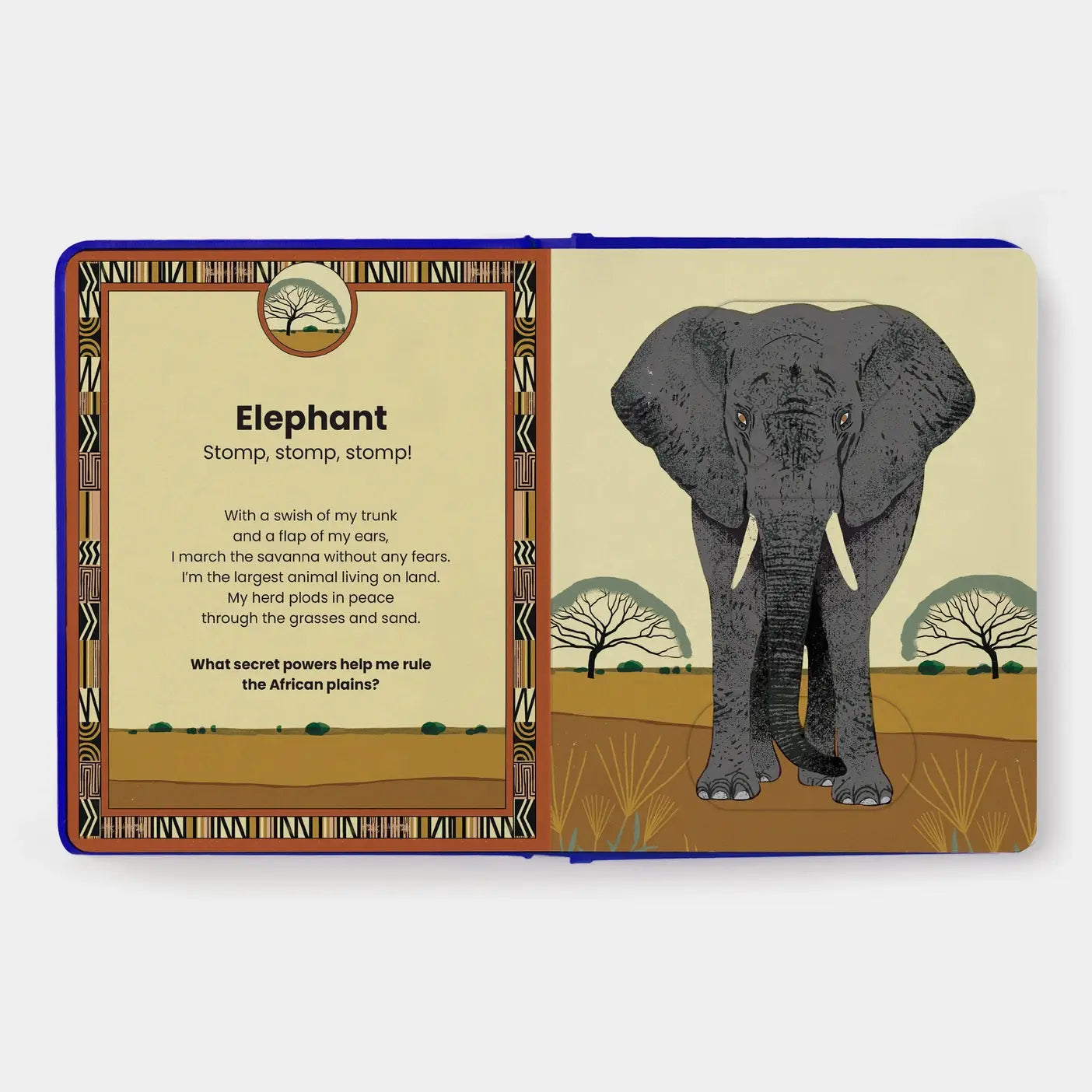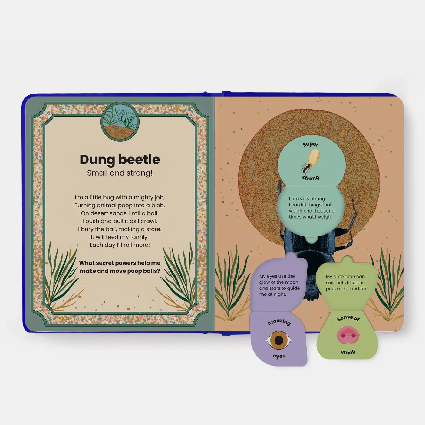 A beautiful, informative, and interactive introduction to 10 of the world’s most amazing animals and their ‘secret powers’. This dazzling nonfiction board book invites curious children to learn about the wonders of the animal kingdom. The Secret Powers of Animals features 10 fascinating creatures, each with physical features that offer amazing abilities. From an African elephant and a narwal to a domestic cat and a dung beetle, these awe-inspiring species reflect earth’s incredible biodiversity. Following in the footsteps of Superpowered Animals, selected by Smithsonian Magazine as one of the ten best children’s books of 2023, this new board book edition for children aged 2-5 presents simplified information through playful text and a lift-the-flap guessing game format. With its frame-worthy animal illustrations and informative science-led approach, this stylish, unique book will wow any animal-loving child.